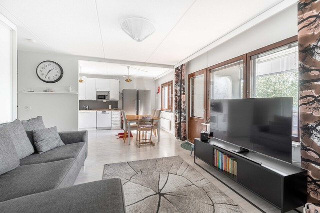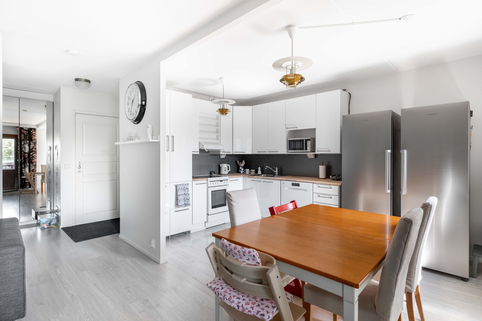 Tässä kodissa tehtiin laaja pintaremontti vuonna 2021, jonka myötä asunto sai modernin ja raikkaan ilmeen. Kodissa on kolme tilavaa makuuhuonetta, tyylikkäästi remontoitu kylpyhuone saunalla ja erillinen wc (remontit toteutettu vuonna 2019) sekä avara olohuone-keittiö, jossa riittää tilaa isommallekin perheelle.