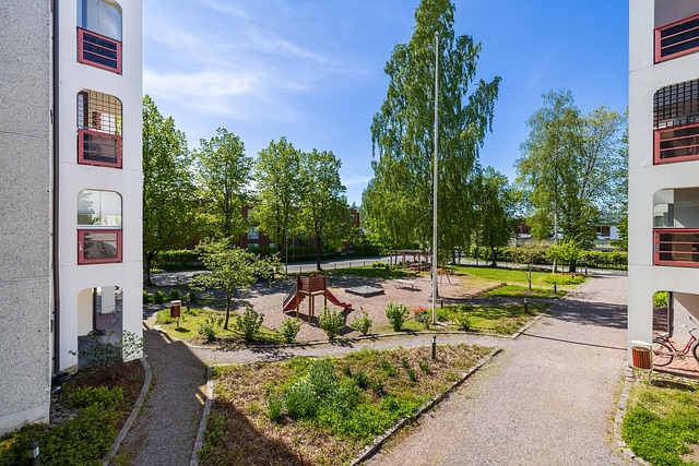 The building is well-maintained and stands on its own plot, featuring a large shared courtyard with a playground and pergola for residents to enjoy.