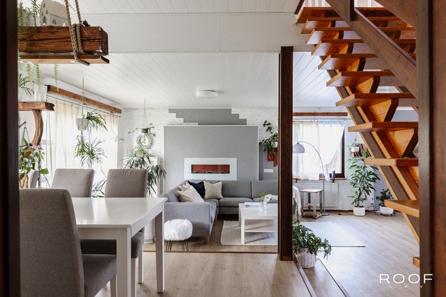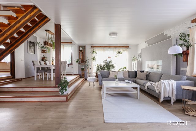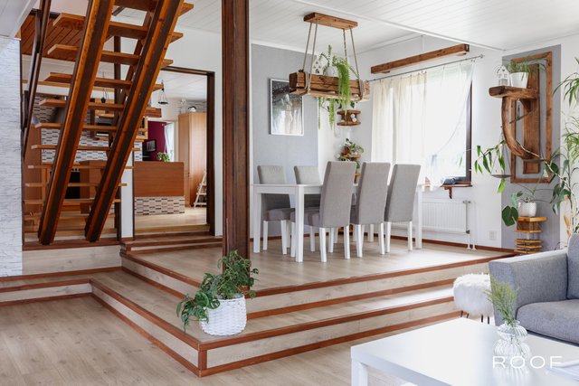 - Todella iso olohuone, hieman ylemmällä tasolla ruokailutila olohuoneen yhteydessä.