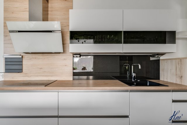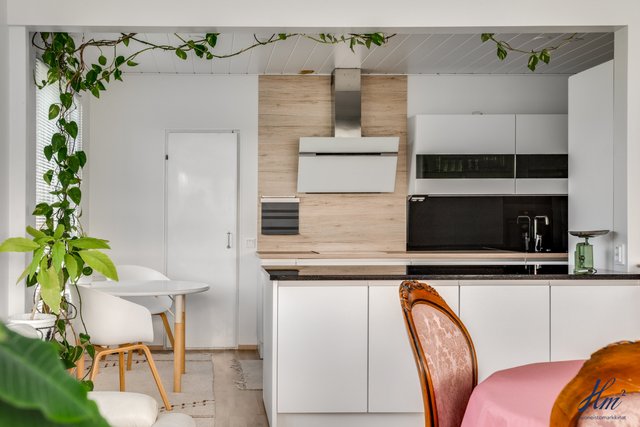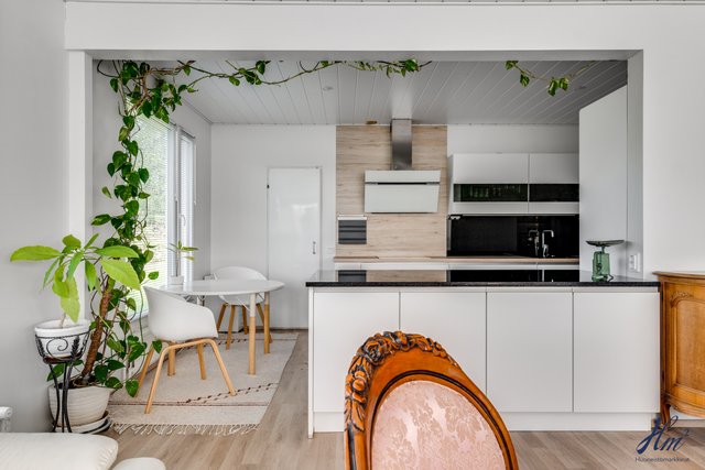 - Jääkaappipakastin, liesi, liesituuletin, mikroaaltouuni, astianpesukone, keittiösaareke, ja höyryuuni