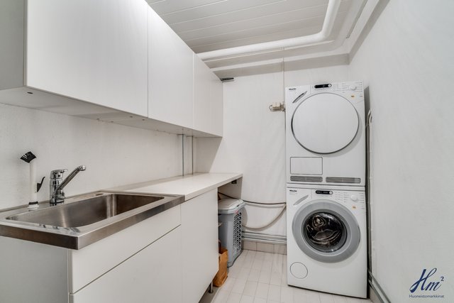 - Pesukone, pesukoneliitäntä, pöytätaso, pyykkikaapit, kuivausrumpu, ja pesuallas