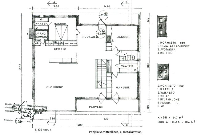 - Rakennuslupa-asiakirjojen mukaan talon talon huoneistoala on 147 m² ja kokonaispinta-ala noin 251 m². Asuinpinta-alaa ei ole määritelty ja kauppaa ei tehdä pinta-ala perusteisesti vaan myydään kokonaisuutena.
