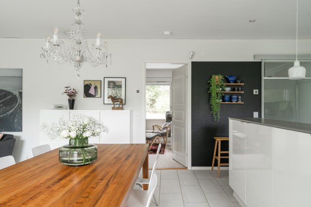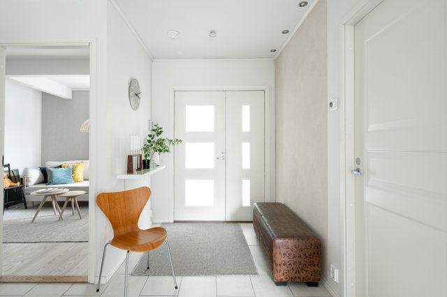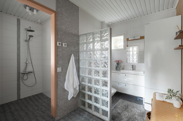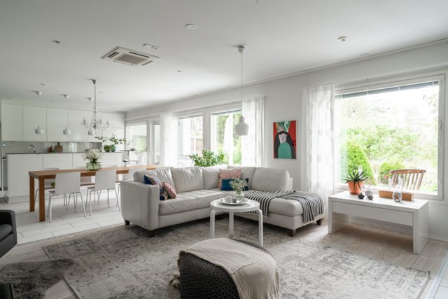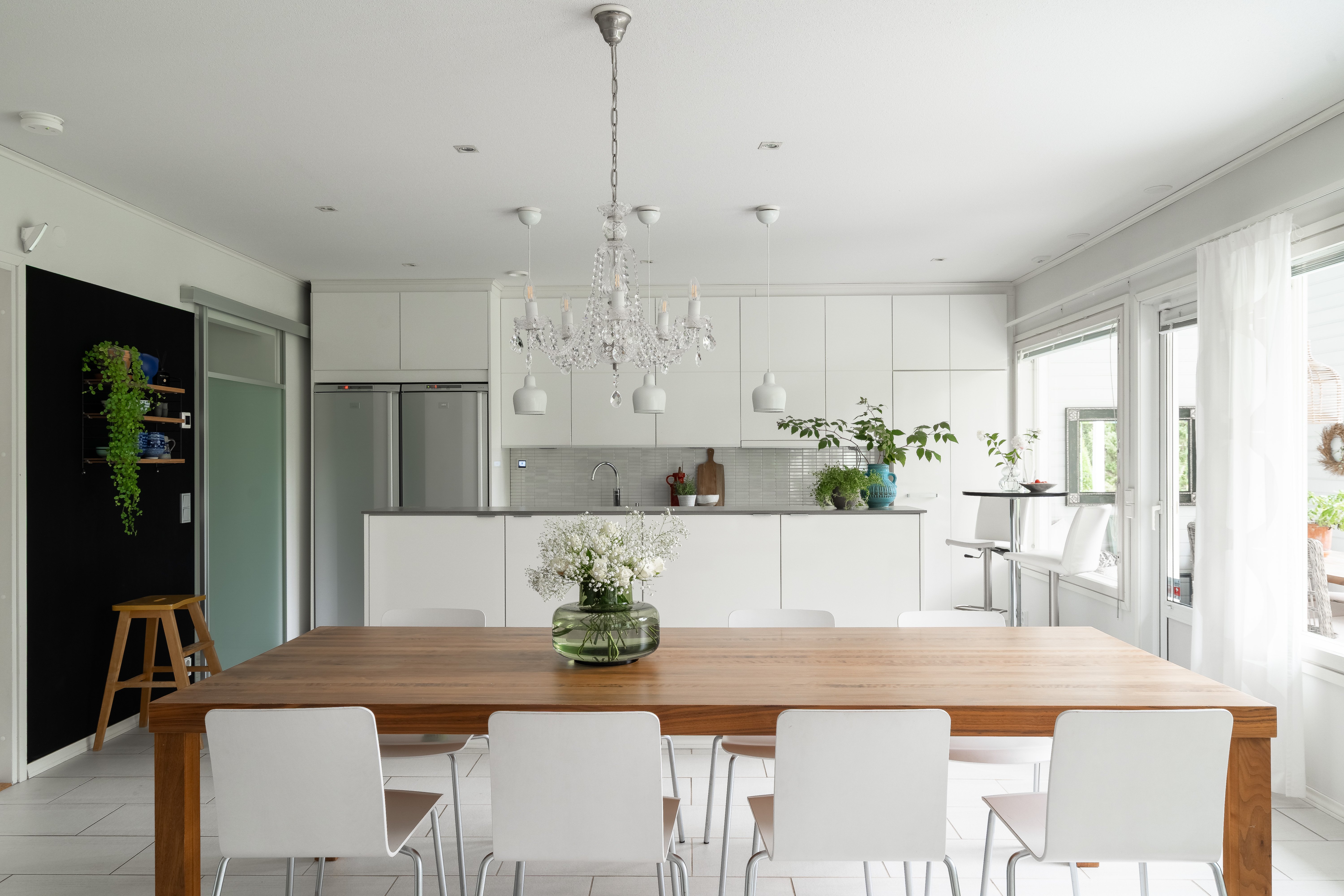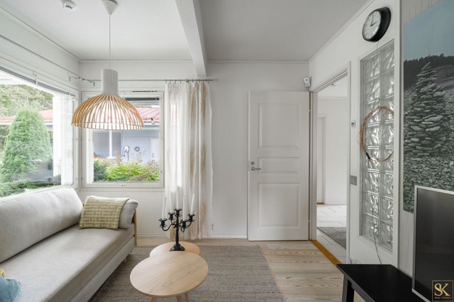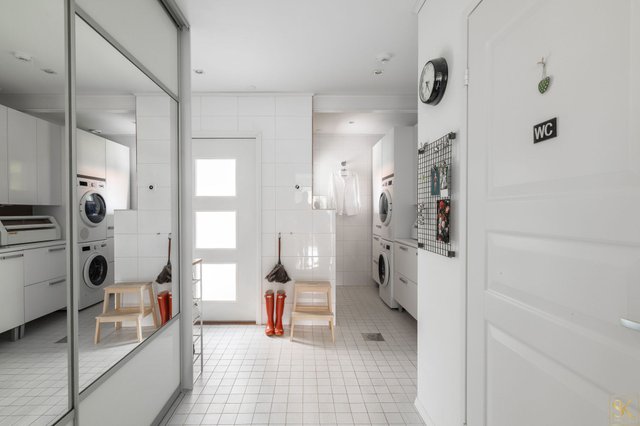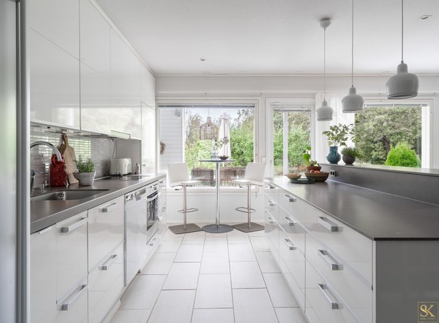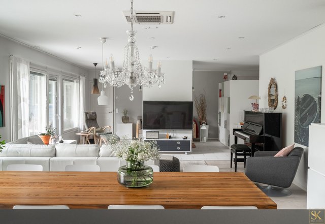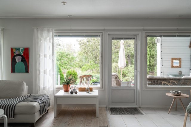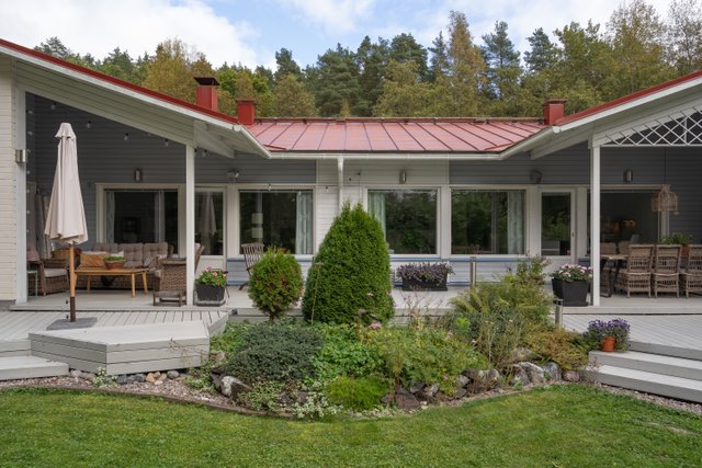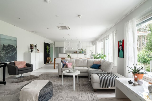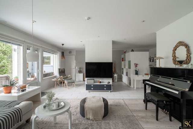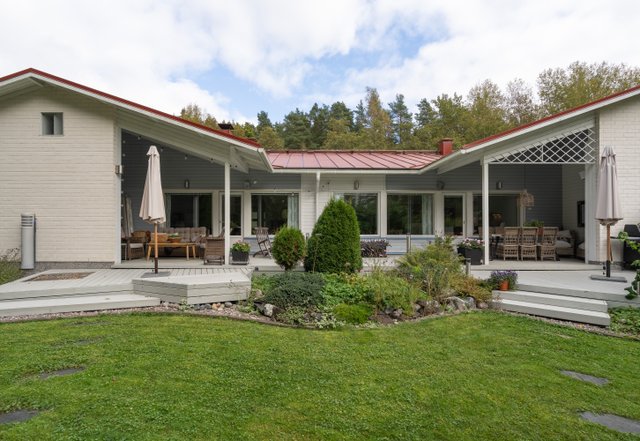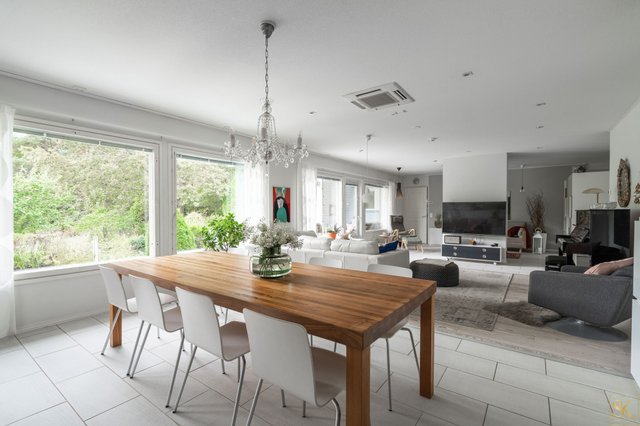 Tässä upeassa, yksitasoisessa kodissa yhdistyvät arjen helppous, moderni elämäntyyli ja kauniit ulkotilat. Asunto on taidokkaasti luotu yhdistämällä kaksi huoneistoa, jolloin tilaa ja omaa rauhaa on sopivasti niin sisällä kuin ulkona.