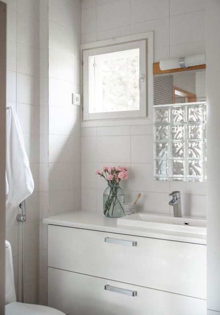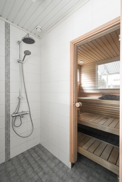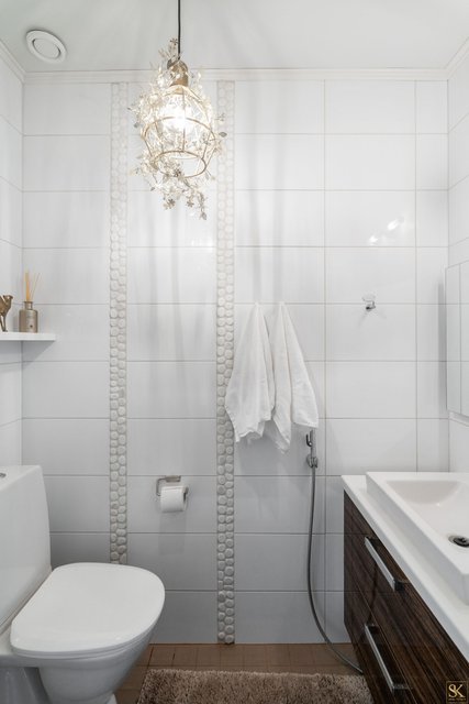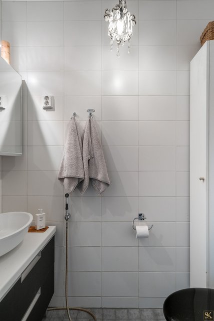 - Suihku, wc-istuin, bidee-suihku, lattialämmitys, allaskaappi, ja pesuallas
