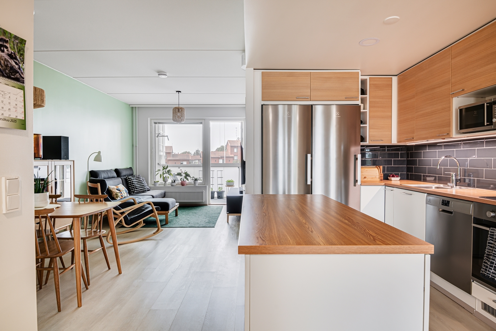 Nuorekkaassa asunnossa on kiinnitetty huomiota kestäviin ja helppohoitoisiin pintamateriaaleihin. Seinät on enimmäkseen maalattu ja lattiaan on asennettu yhtenäinen kivikomposiittivinyylilankku.