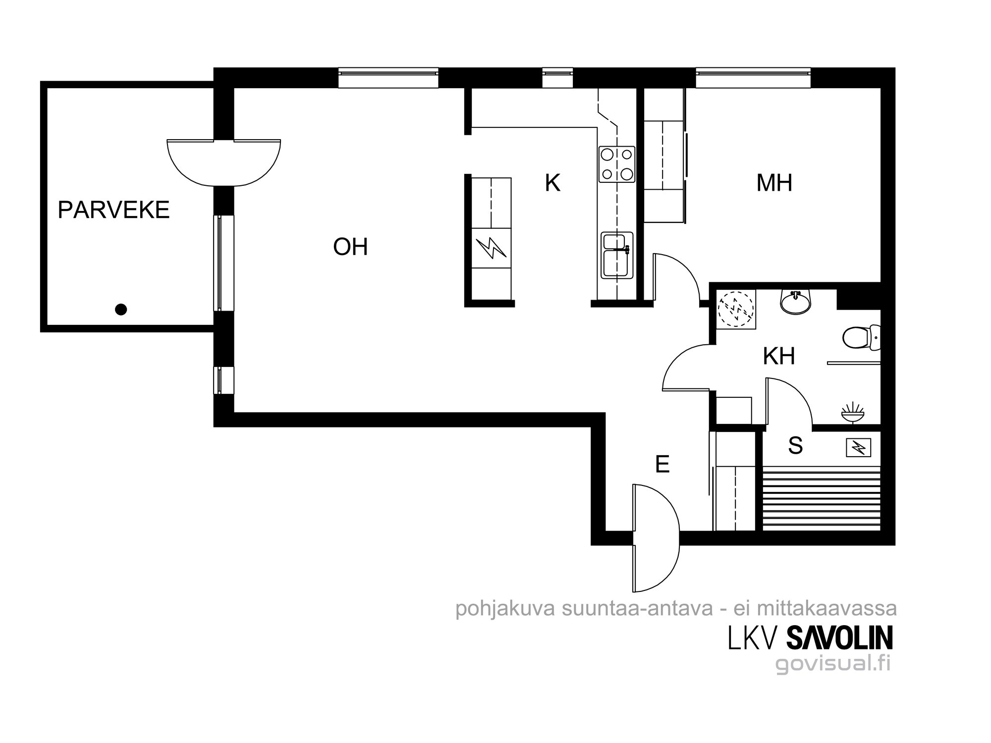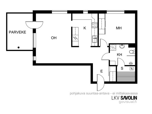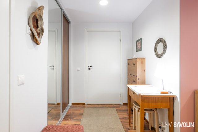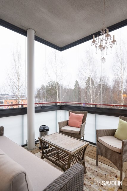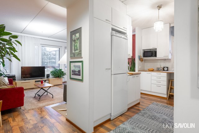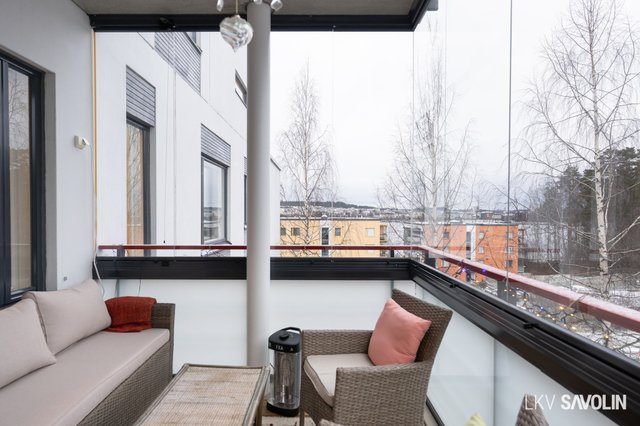 Erittäin hyvä ja onnistunut pohjaratkaisu. Toimiva keittiö/olohuonetila, joka jatkuu luontevasti lasitetulla parvekkeella. Tilava makuuhuone, jossa sopivasti väljyyttä ja säilytystilaa. Hyvin varusteltu kylpyhuone sekä oma sauna.