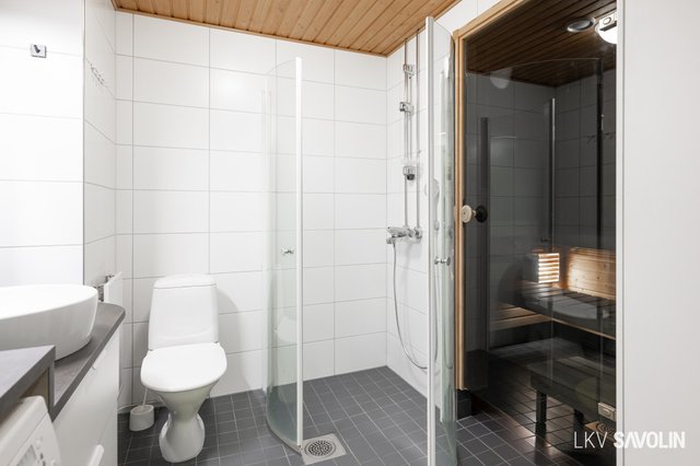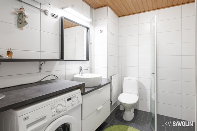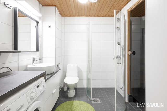 - WC-istuin, suihku, suihkuseinä, lattialämmitys, allaskaappi, pesukoneliitäntä, ja peili