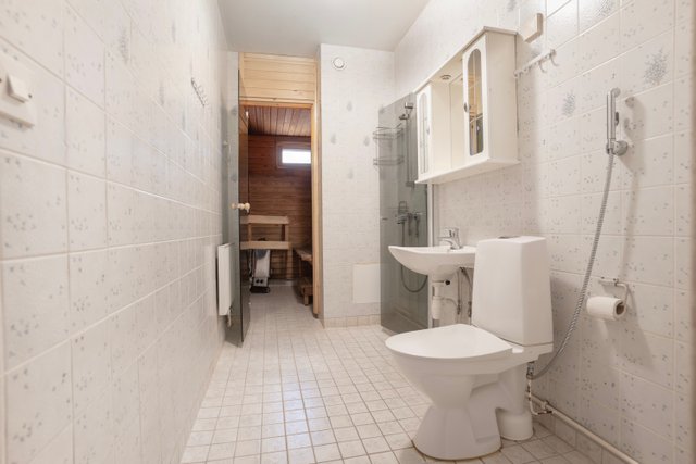 - WC-istuin, suihku, peilikaappi, pesukoneliitäntä, ja bidee-suihku