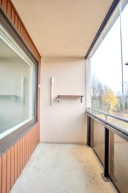 Asunnon etelään suuntautuva lasitettu parveke jatkaa oleskelutilaa ja toimii ihanana lisähuoneena keväästä syksyyn.