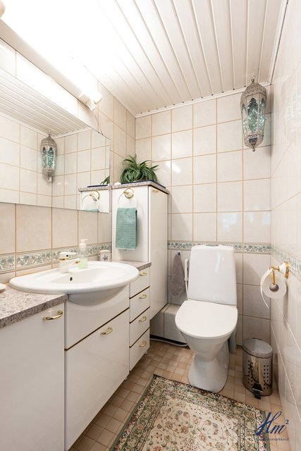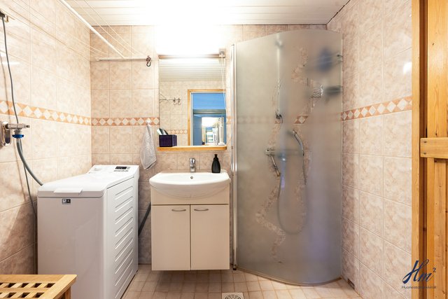 - Suihku, suihkuseinä, pesukoneliitäntä, pesuallas, allaskaappi, ja peili