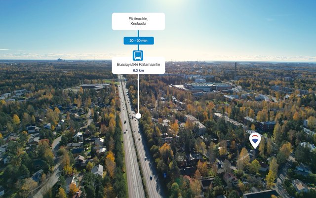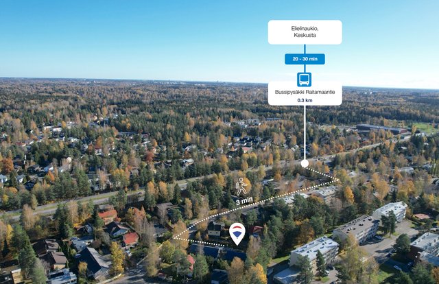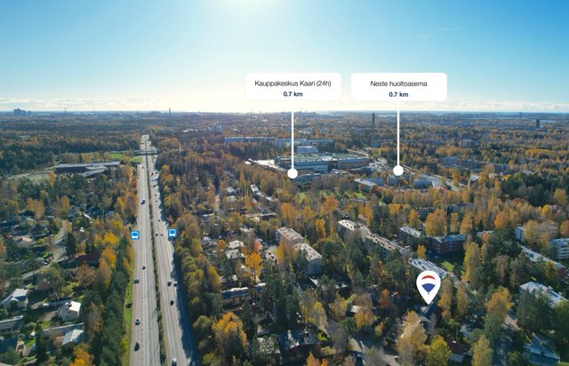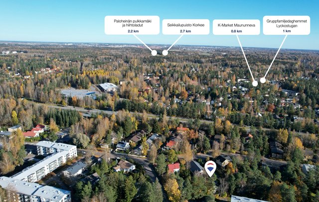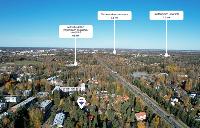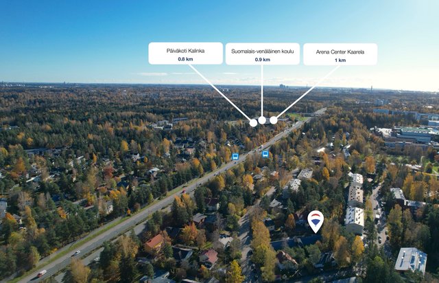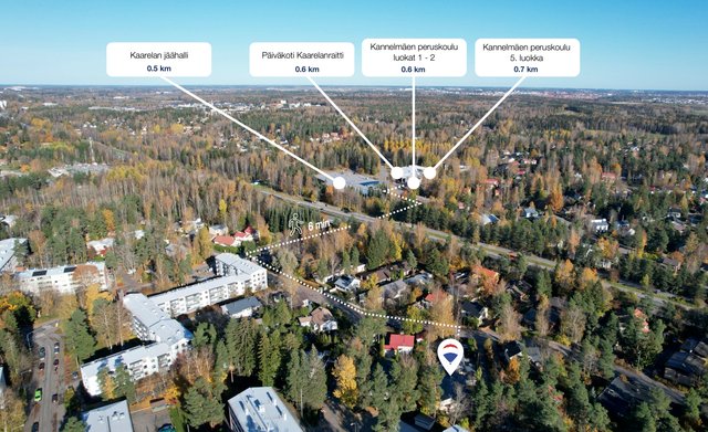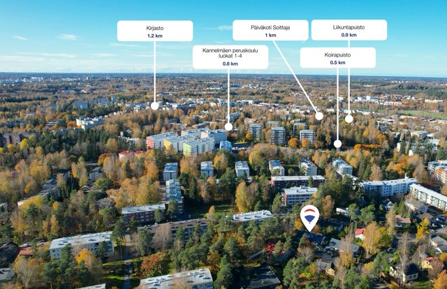 - KOULUT: 0.6 km - Kaarelan Raitti 1 (luokat 1-2) 0.7 km - Kaarelan Raitti 3 (5. luokka) 0.8 km - Kanneltie 1 (luokat 1-4) 0.9 km - Suomalais-venäläinen koulu 0.9 km - Runonlaulajantie 40 / valmistuu 2027 (luokat 5-9) 1.2 km - Pelimannintie 16 (luokat 5-9) PÄIVÄKODIT: 0.6 km - Päiväkoti Kaarelanraitti 0.8 km - Päiväkoti Kalinka 1.0 km - Päiväkoti Kannel 1.0 km - Päiväkoti Soittaja 1.0 km - Gruppfamiljedaghemmet Lyckostugan 1.4 km - Päiväkoti Pelimanni 1.4 km - Päiväkoti Aurinkokallio BUSSIMATKAT: 0.3 km - Bussipysäkki Hämeenlinnanväylällä (Raitamaantie) 2-3 minuutin kävely bussipysäkille 20-30 min Suora bussiyhteys Elielinaukiolle. JUNAMATKAT: 1.2 km - Kannelmäen juna-asema noin 10 minuutin kävelymatka juna-asemalle 14 min junamatka Helsinkiin (I-Juna) ULKOILU: 0.5 km - Koirapuisto 0.5 km - Jäähalli 0.7 km - Kaarelan kenttä 0.9 km - Liikuntapuisto 2.2 km - Paloheinän pulkkamäki 2.6 km - Palettilammen uimaranta (10 min pyörällä) 3.8 km - Vetokannaksen uimaranta (15 min pyörällä) KAUPAT / PALVELUT: 0.6 km - Alepa 0.6 km - Kannelmäen kirkko 0.7 km - Kauppakeskus Kaari (24/7) 0.8 km - K-Market 1.0 km - Kuntokeskus Liikku ja Arena Center. 1.2 km - Kirjasto