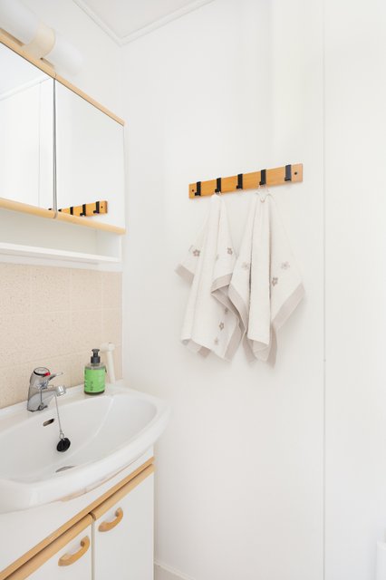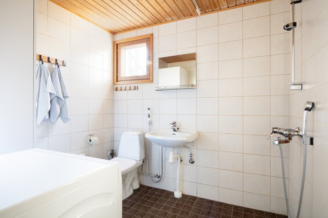 - Kylpyhuone on remontoitu vuonna 2009 vesieristyksineen. Varusteet: suihku, pyykinpesukoneliitäntä, sähköinen lattialämmitys, peili, allas, wc-istuin, bidee-suihku.