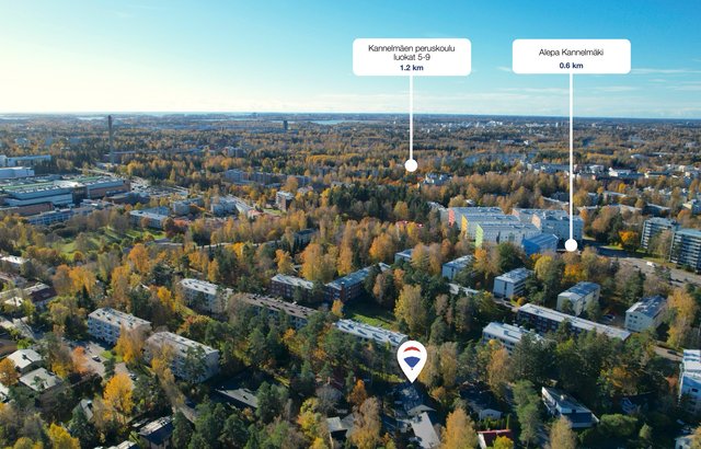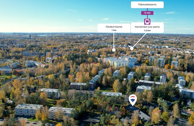 Tervetuloa Kannelmäen parhaille paikoille! Koulumatkat ovat lyhyitä ja helppokulkuisia alle 10 minuutin kävelymatkoja. Nopeat 20-30 minuutin bussilinjat Elielinaukiolle kulkevat vain 3 minuutin kävelymatkan päässä Hämeenlinnanväylällä. Myös juna-asema on lähellä ja sinne pyöräilee muutamassa minuutissa. Junamatkan kesto päärautatieasemalle on vain 14 min. Nopeista yhteyksistä huolimatta liikenteen ääni ei ole täällä häiritsevää. Vain 700 metrin päästä löydät myös Kauppakeskus Kaaren, jossa sijaitsee mm. lukuisia ravintoloita, Tokmanni, Gigantti sekä Suomen suuri Prisma (24/7). Lähialueen kaduilta löydät myös pienempiä kauppoja sekä useita ulkoilumahdollisuuksia mm. liikuntapuiston ja koira-aitauksen. Kesäisin pyöräilet kotipihasta uimarannalle alle 10 minuutissa vaikka joka päivä!