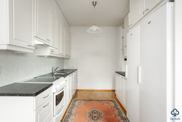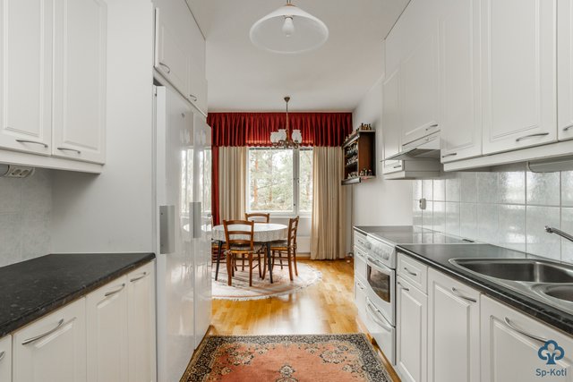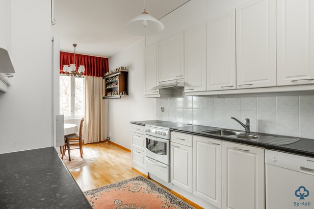 - Korkeat jääkaappi ja pakastin, keraaminen liesi, liesituuletin ja astianpesukone (epäkunnossa). Lattia parkettia ja seinät maalattu.