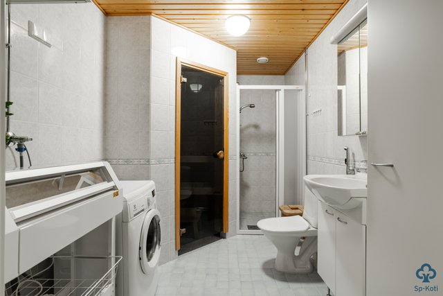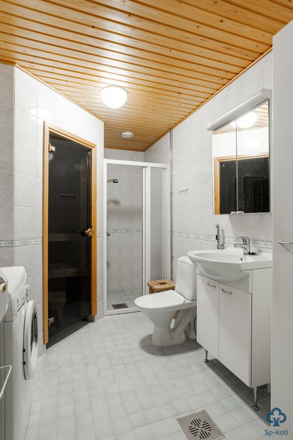 - Suihku, suihkuseinä, wc-istuin, peili- ja allaskaappi, pesukoneliitäntä ja lattialämmitys. Lattia ja seinät laattaa.