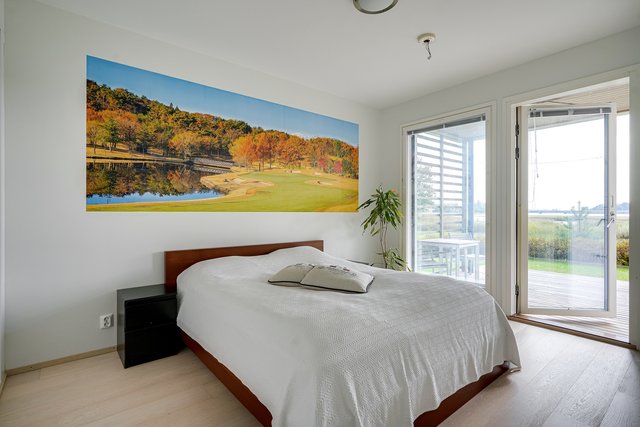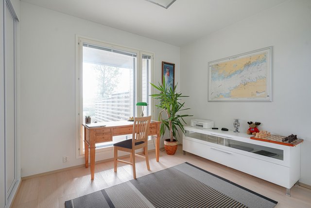 Kolme makuuhuonetta tarjoaa joustavasti tilaa eri tarpeisiin. Alakerran makuuhuoneesta on käynti terassille, josta avautuu näkymät merelle. Oma saunaosasto, kaksi kylpyhuonetta ja kodinhoitohuone tekevät arjesta sujuvaa.