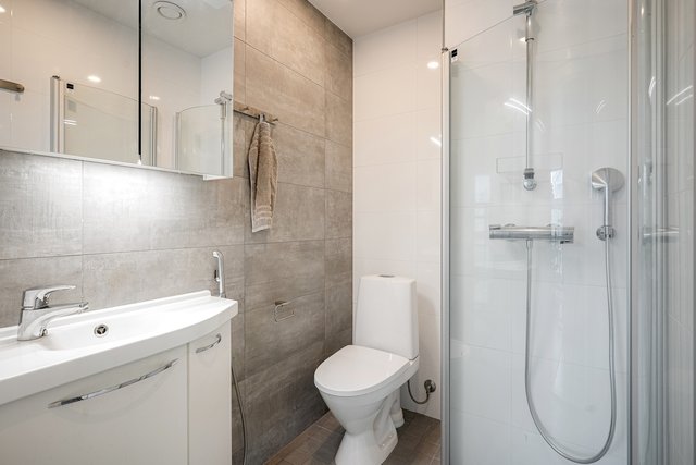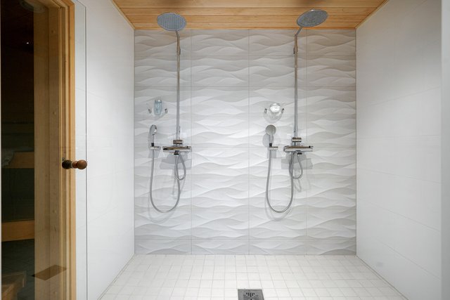 - Alakerran kylpyhuone on saunaosaston yhteydessä. Laatoitetussa kylpyhuoneessa on kaksi suihkua ja lattialämmitys.
