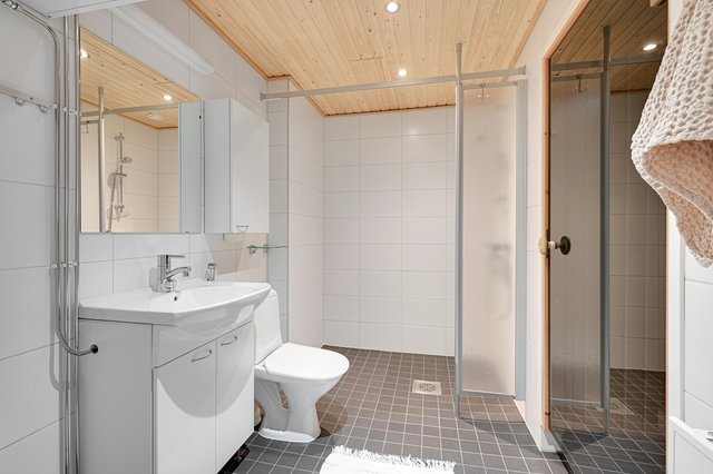 - Tilava kylpyhuone/ wc. Varustus: lattialämmitys (sähkö), wc-istuin, bideesuihku, peili, pesukoneliitäntä (tilavaraus pesutornille), allaskaapisto, suihku, suihkuseinä, tanko suihkuverholle. Lattia ja seinät laattaa.