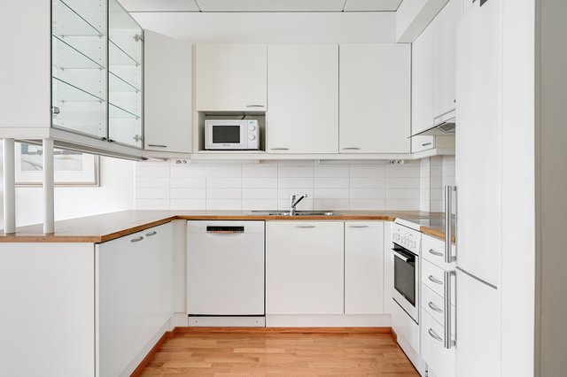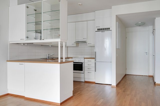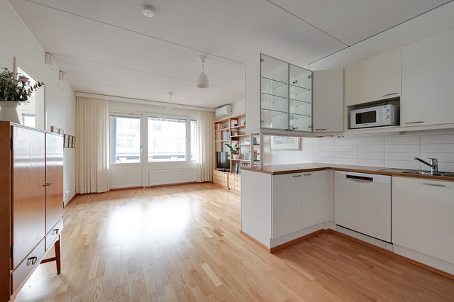 - Keittiö on alkuperäiskuntoinen. Varustus: kaapistot, jääkaappipakastin, keraaminen liesi, liesituuletin, astianpesukone (2022), mikroaaltouuni. Työtasot laminaattia. Lattia: parketti. Seinät: maalattu. Välitila laatoitettu.