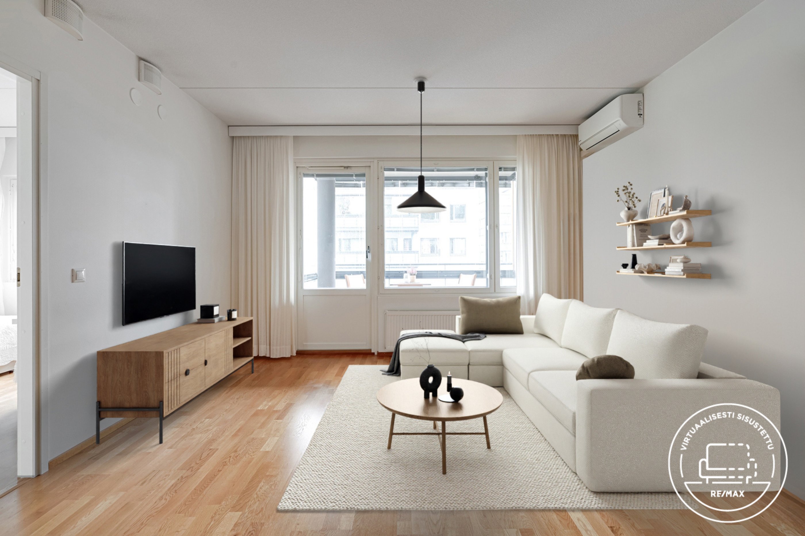 Hissitalon 3. kerroksen kodin olohuoneen jatkeena toimii tilava lasitettu parveke. Aurinkoinen parveke on viimeistelty sälekaihtimilla sekä puisilla lattialaatoilla. Olohuoneen ja koko asunnon viilennyksestä huolehtii vuonna 2022 asennettu ilmalämpöpumppu.