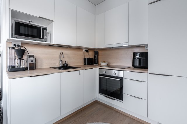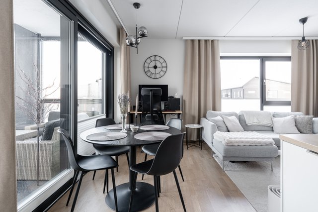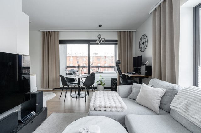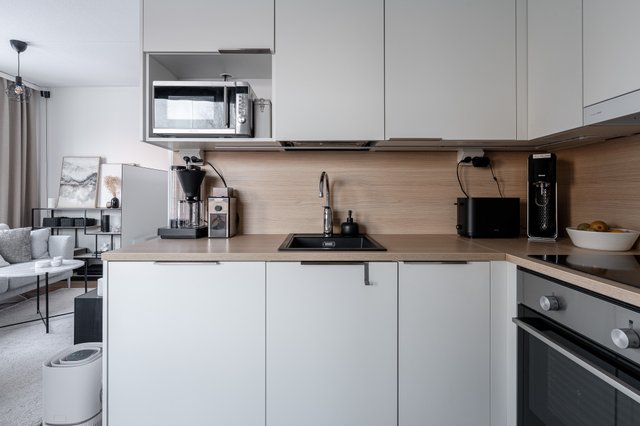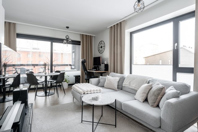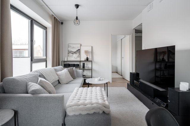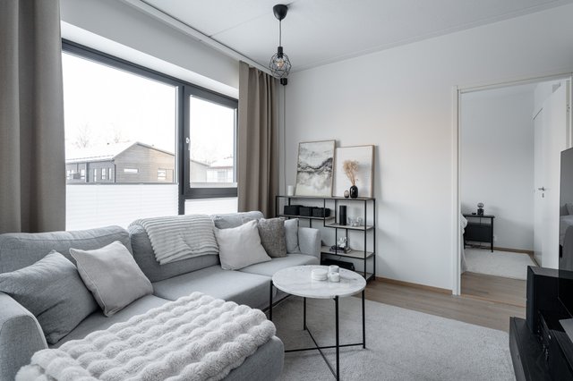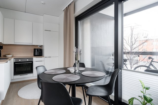 Asunnossa on avara olohuone, joka yhdistyy saumattomasti keittiöön. Keittiö on varusteltu nykyaikaisin kodinkonein, kuten induktioliesi ja astianpesukone. Tilava makuuhuone tarjoaa rauhallisen levähdyspaikan, ja parvekkeella voit nauttia ilta-auringosta.