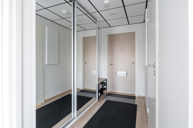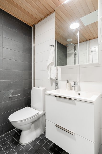 - WC-istuin, suihku, suihkuseinä, pesukoneliitäntä, lattialämmitys, peilikaappi, pesuallas, allaskaappi, ja bidee-suihku