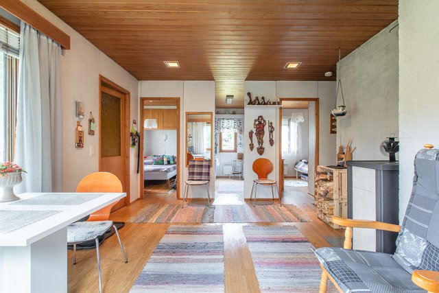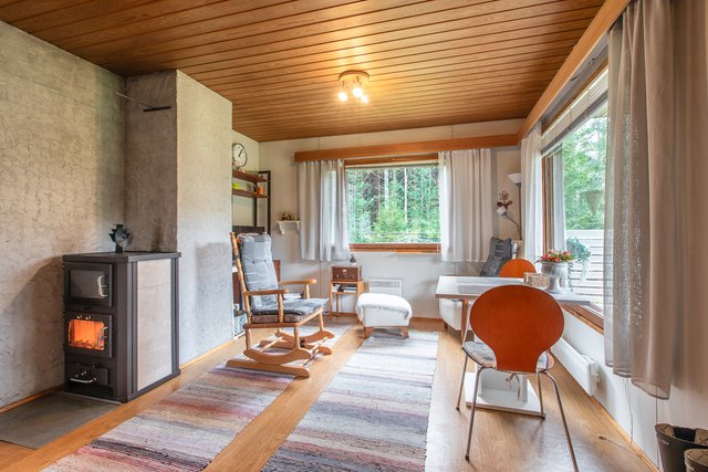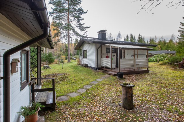 Tämä 1981 rakennettu puurunkoinen mökki tarjoaa 52 neliötä viihtyisää tilaa, jossa on kaksi makuuhuonetta, olohuone, keittiö ja sauna. Puulämmitteinen sauna ja olohuoneen kamiina luovat aidon mökkitunnelman, ja pesuhuoneesta pääset suoraan vilvoittelemaan katetulle terassille.