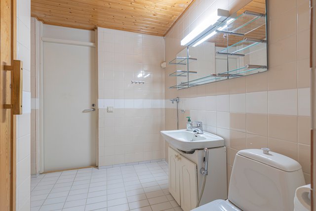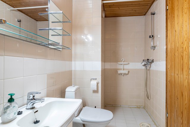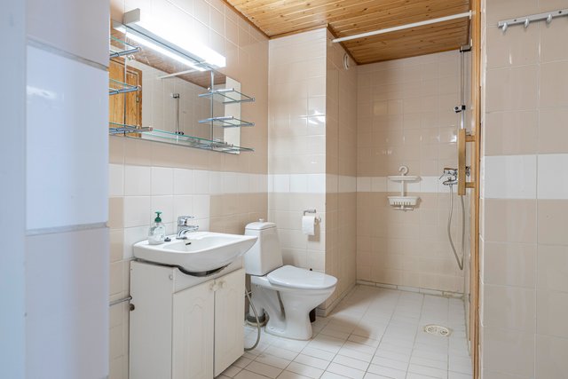 - Suihku, wc-istuin, peili, pesuallas, allaskaappi, ja bidee-suihku