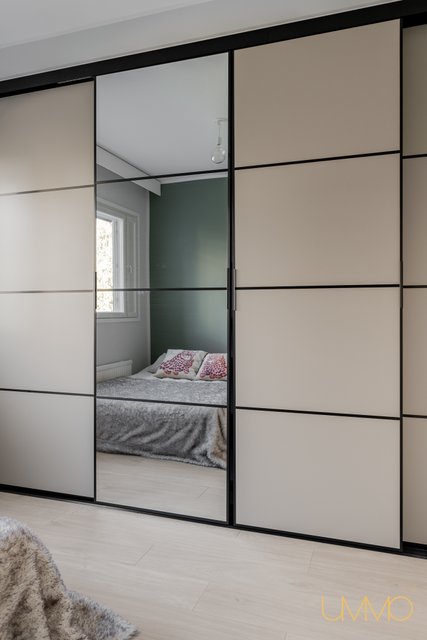- Eteisessä ja makuuhuoneessa kiinteät kaapistot koko seinän leveydeltä.