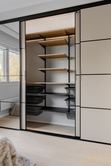 - Vaatekaapissa valo ja hyvät vetolaatikostot, hyllyjä ja tankotilaa.