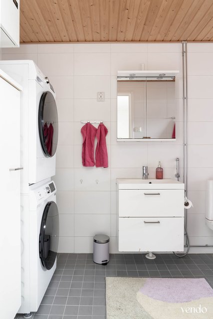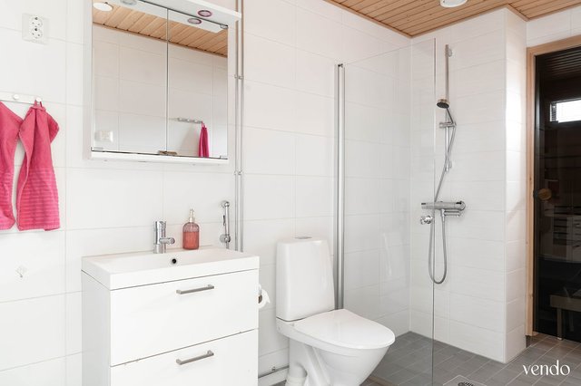 - WC-istuin, suihku, suihkuseinä, pesukoneliitäntä, peilikaappi, bidee-suihku, pesuallas, ja lattialämmitys