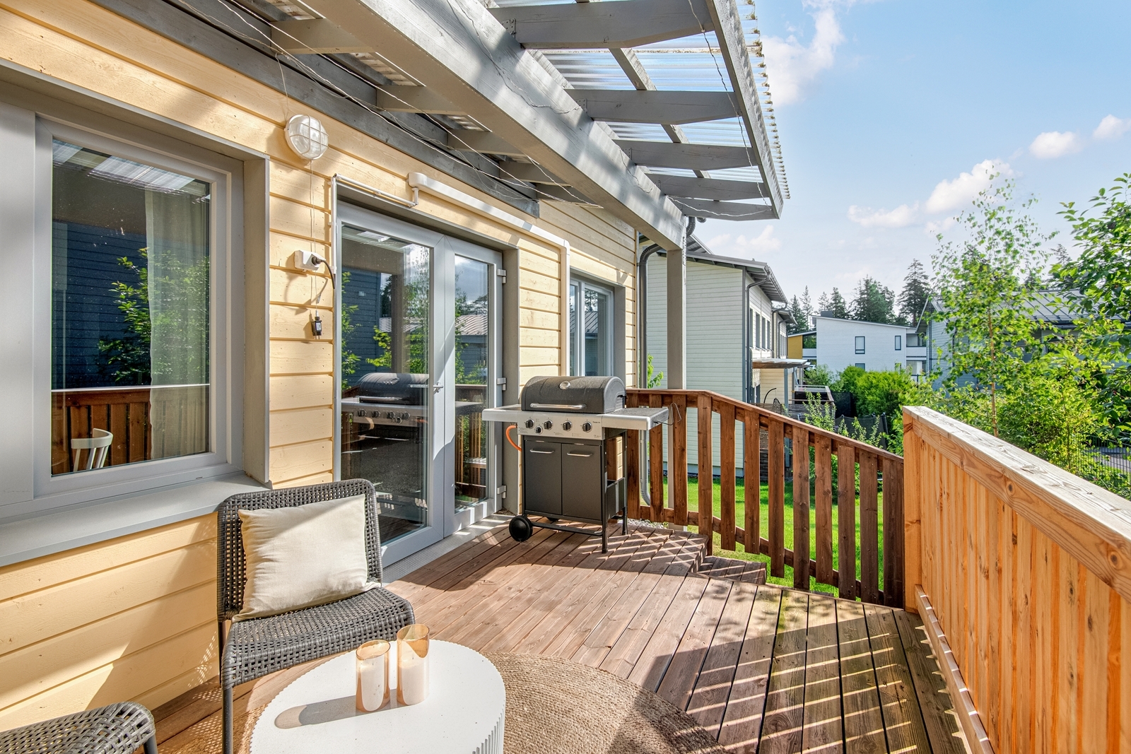 Viihtyvyyttä lisää kodin piha-alue terasseineen, etelään suuntautuvalla aurinkoisella terassilla kelpaa nautiskella kesäpäivistä. Myös sisääntulon yhteydessä on pieni piha-alue.
