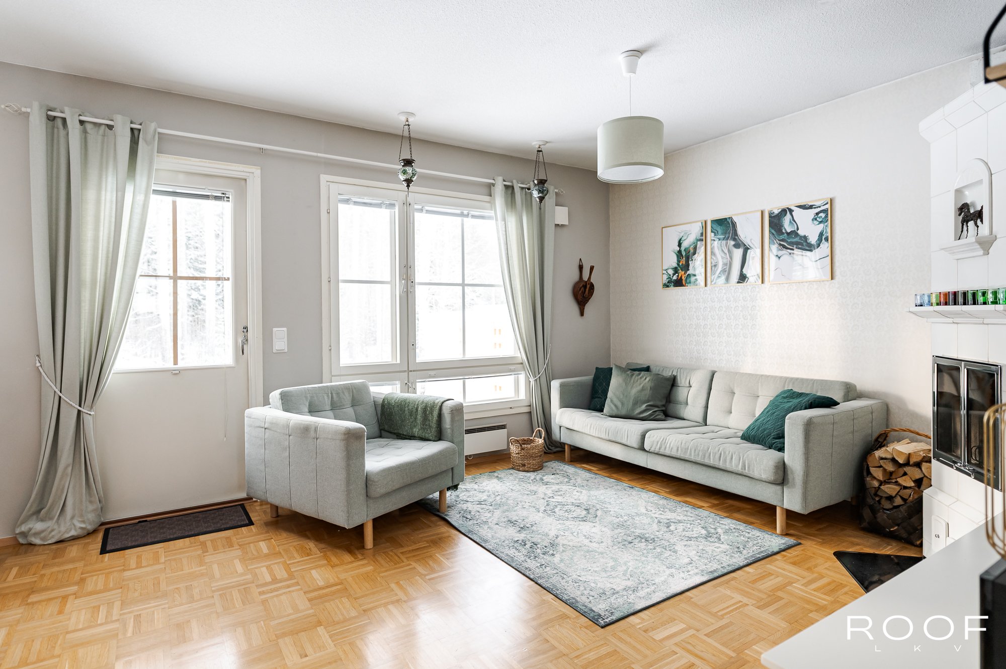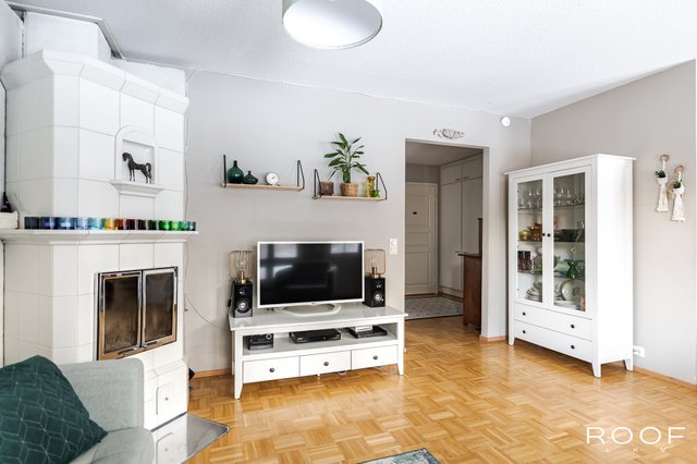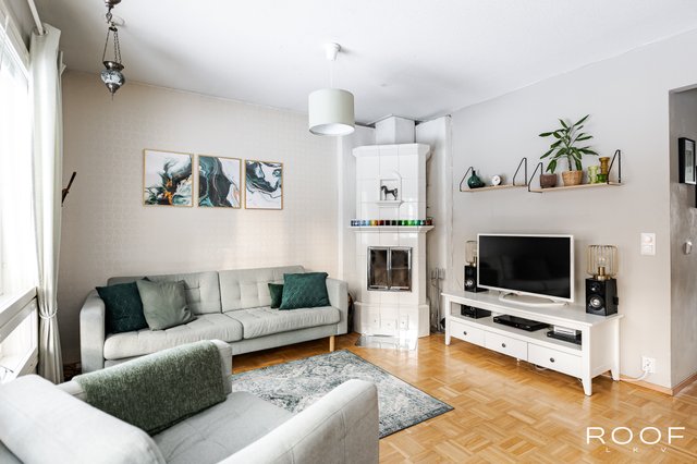Asunnon sydän on olohuone, jossa lämpöä ja tunnelmaa luo varaava takka.