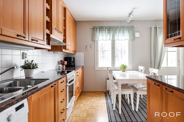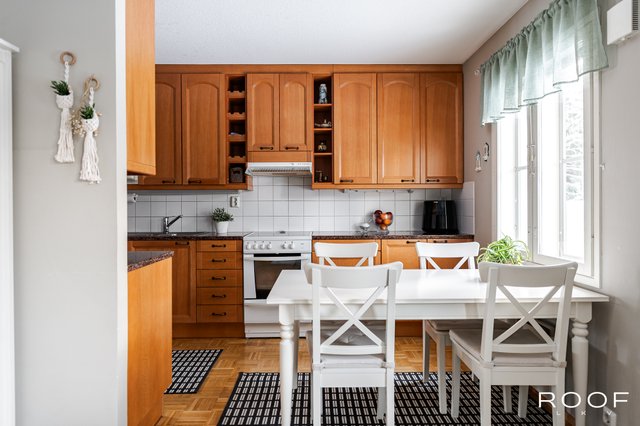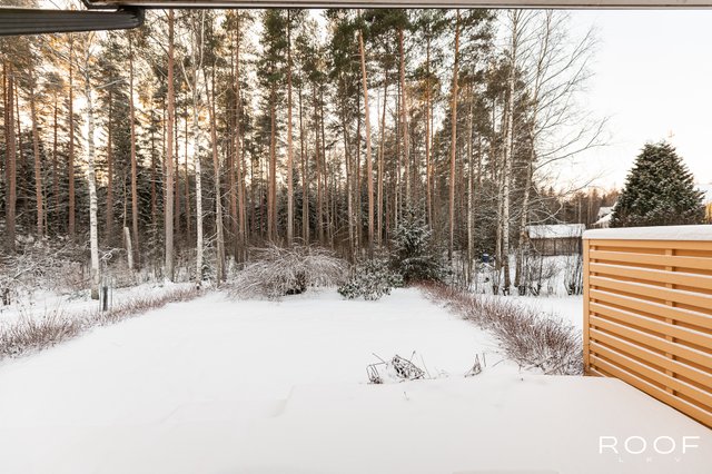 Terassilta ja takapihalta avautuvat vehreät näkymät metsään, mikä tuo luonnon lähelle. Keittiössä on kivasti kaappitilaa ja tyylikkäät kivitasot, jotka tuovat ripauksen luksusta arkeen.