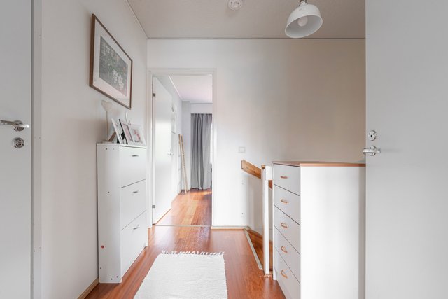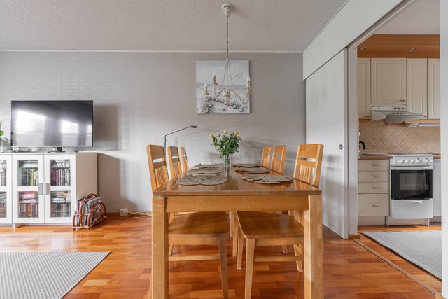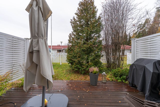 Kodin sydän on avara olohuone, jossa on tilaa myös ruokailuryhmälle. Keittiö on varustettu vaaleansävyisillä kaapistoilla. Kaksi makuuhuonetta tarjoavat rauhalliset puitteet levolle, ja säilytystilaa löytyy runsaasti vaatehuoneesta ja ulkovarastosta.
