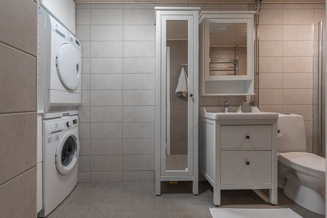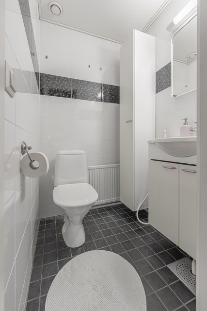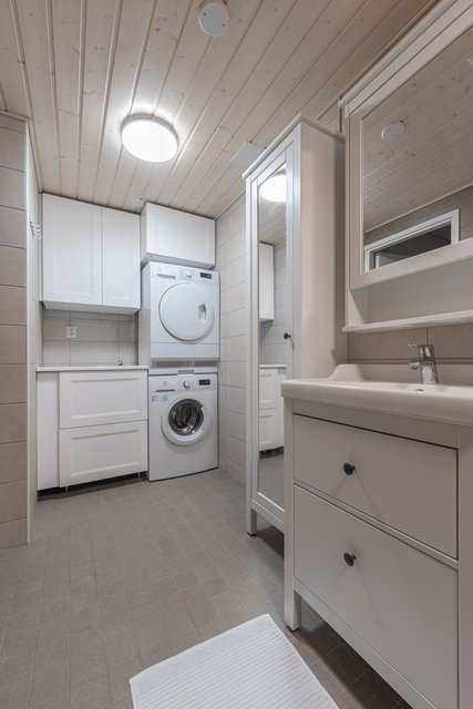- WC-istuin, suihku, pesukoneliitäntä, lattialämmitys, pesuallas, ja allaskaappi