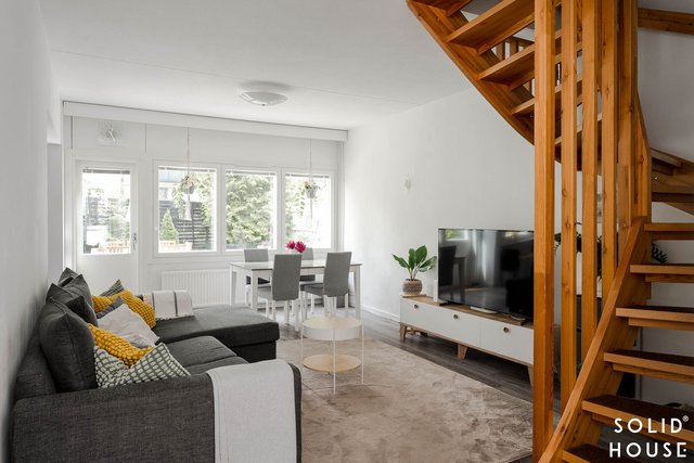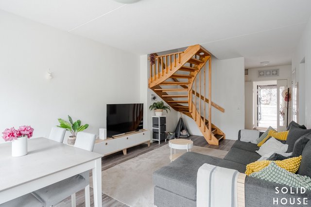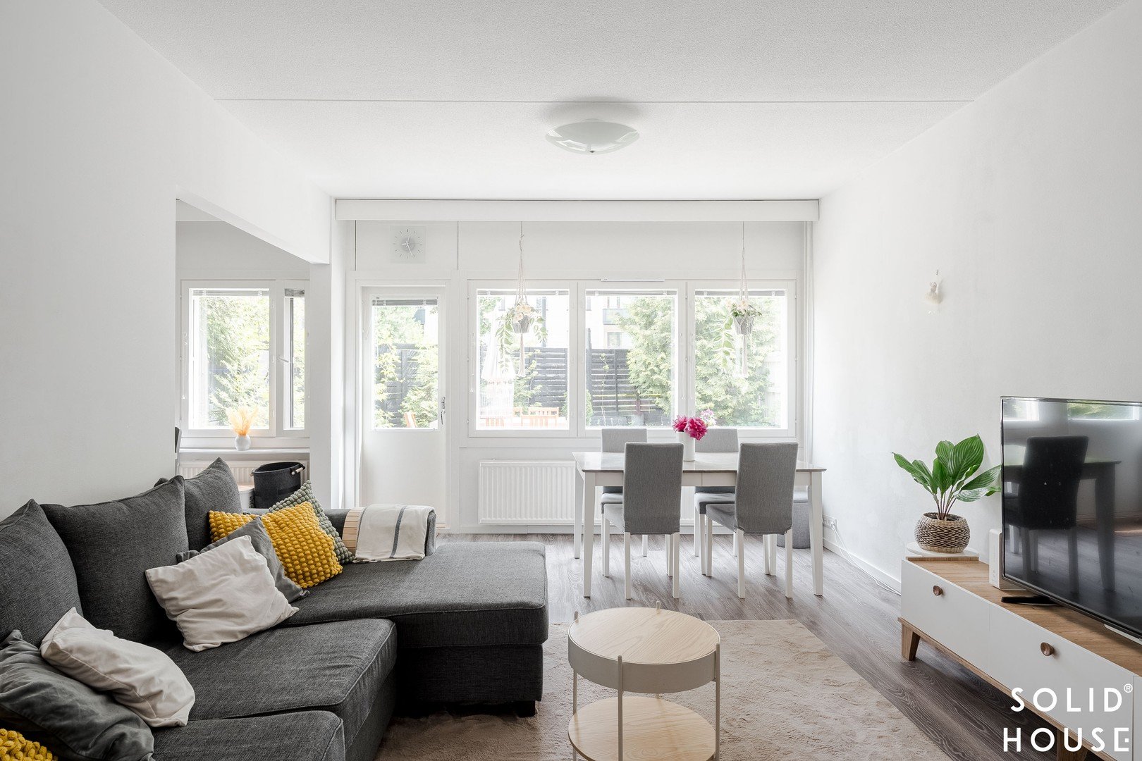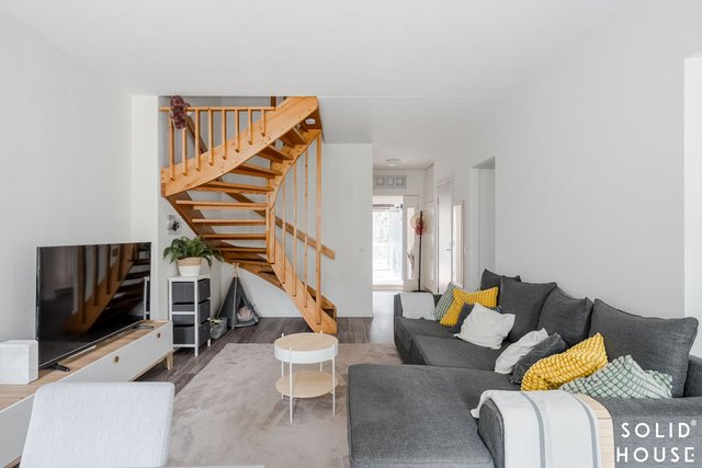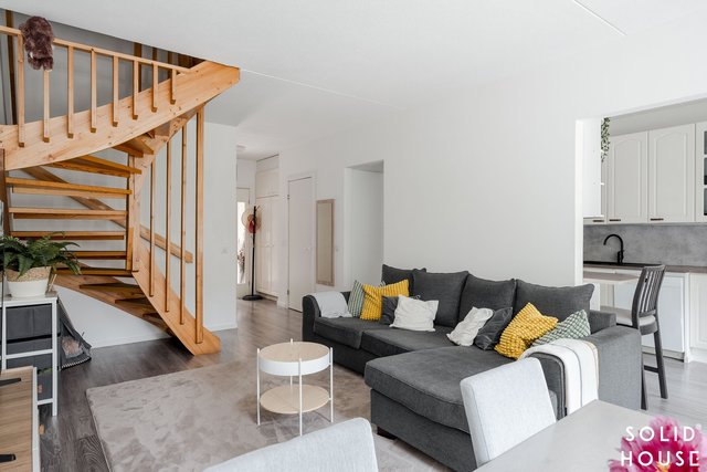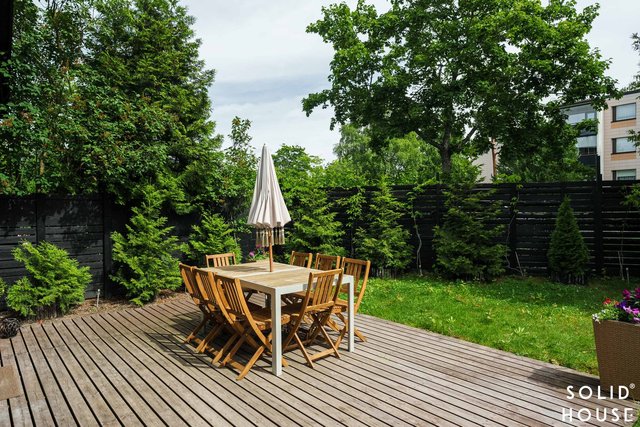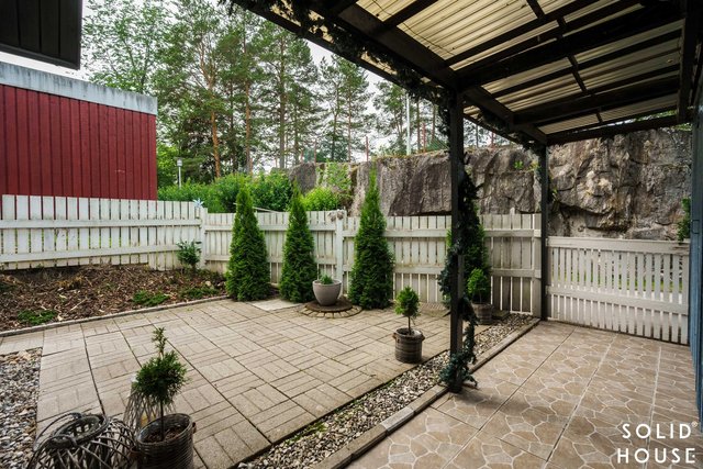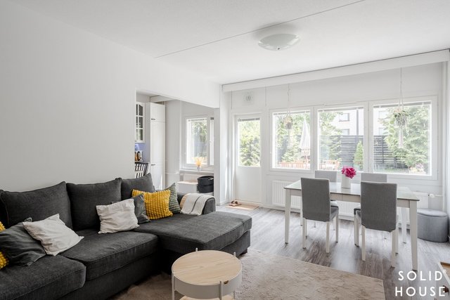 Olohuone on avara ja sijaitsee keittiön vieressä. Käynti olohuoneesta kivalle terassille, jossa runsaiden istutusten keskellä nautit ihanista kesäaamuista.