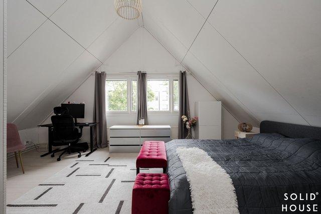 Yläkerran makuuhuoneissa on hulppeat tilat.