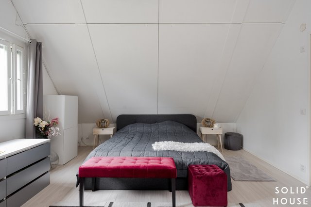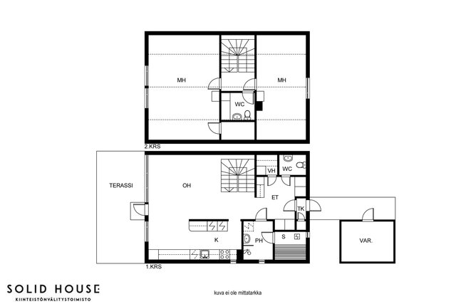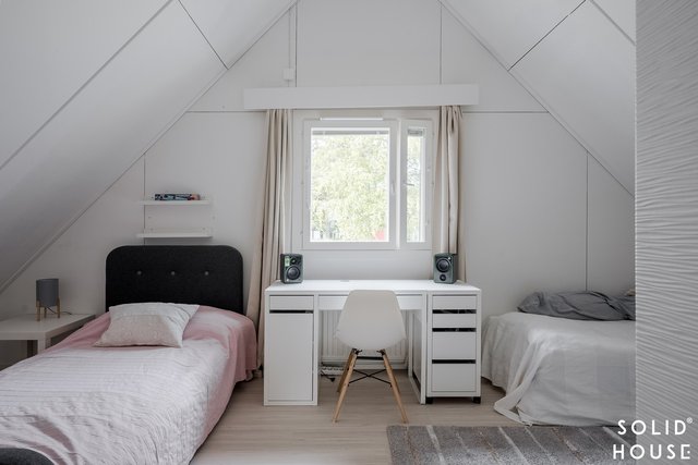 - Lattiat laminaattia, seinät maalattu. Molemmat makuuhuoneet sijaitsevat yläkerrassa.