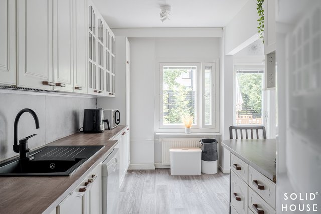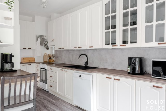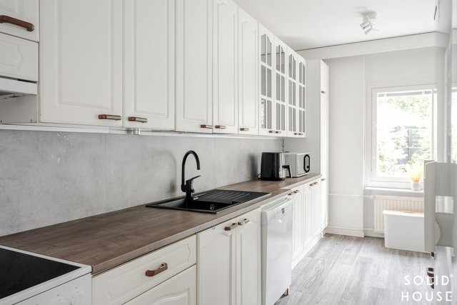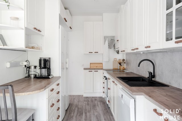 - Kaapistot, jääkaappi, erillinen pakastin, liesituuletin, astianpesukone ja liesi. Työtasot laminaattia. Lattia laminaattia (alkuperäinen parketti laminaatin alla), seinät maalattu.