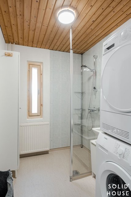 - Laatoitettu suihkunurkka, suihku, pesuallas, pesukoneliitäntä. Lattia ja seinät muovimattoa.