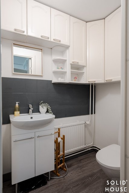 - Alakerran wc:n lattia laminaattia (kaakelit laminaatin alla), seinät maalattu. Yläkerran wc:n lattia kaakelia, seinät maalattu.