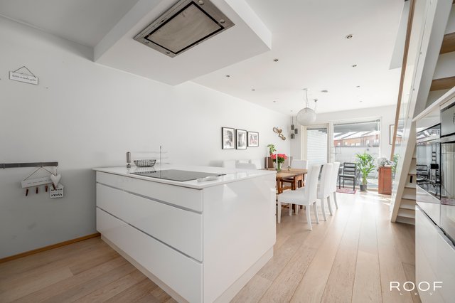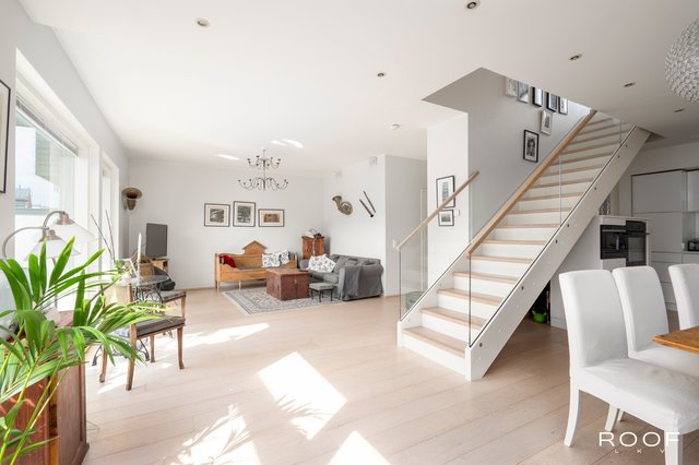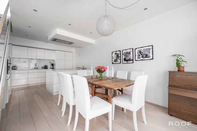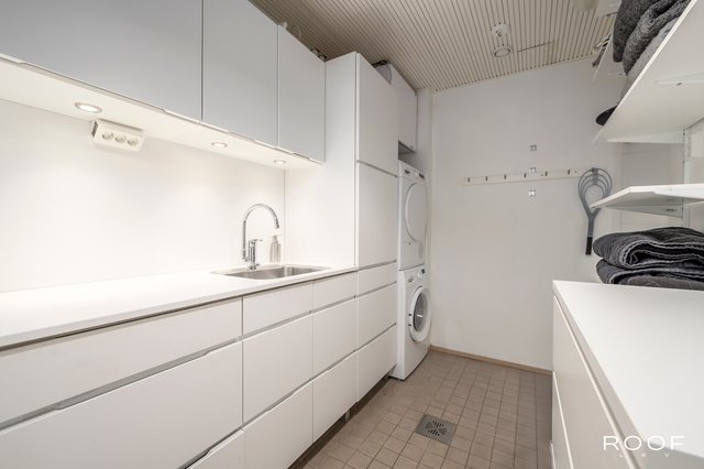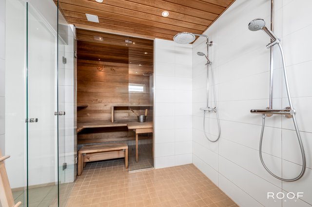 Kodin avokeittiö on varustettu laadukkailla Gram-kodinkoneilla, ja olohuoneen parkettilattia luo lämpimän tunnelman. Kolme makuuhuonetta tarjoavat runsaasti tilaa perheenjäsenille, ja kahdessa makuuhuoneessa on käytännölliset liukuovikaapistot. Kylpyhuoneessa on kaksi suihkua ja ammevalmius, ja sauna tarjoaa rentouttavat löylyt lämpöhaapapaneloinneilla.