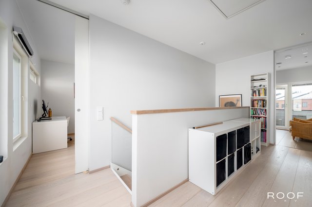 Yläkerran ison makuuhuoneen ja toisen makuuhuoneen välinen seinä on laitettu kiinni. Aiemmin liukuovi.