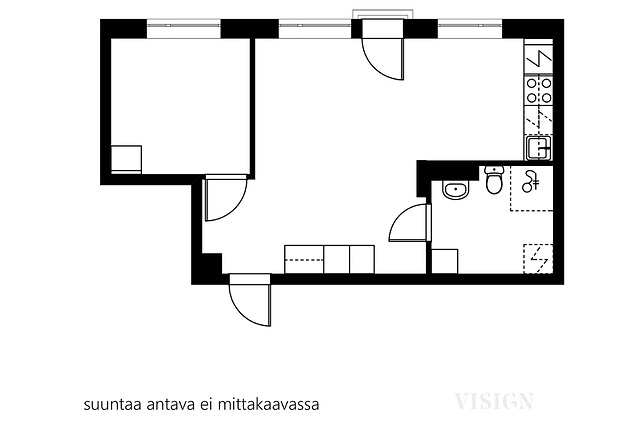 Yhtenäisessä keittiö-olohuoneessa on mukavasti tilaa oleskeluun ja ruokailuun. Huoneisto on valoisa, isot ikkunat sekä olo- että makuuhuoneessa.