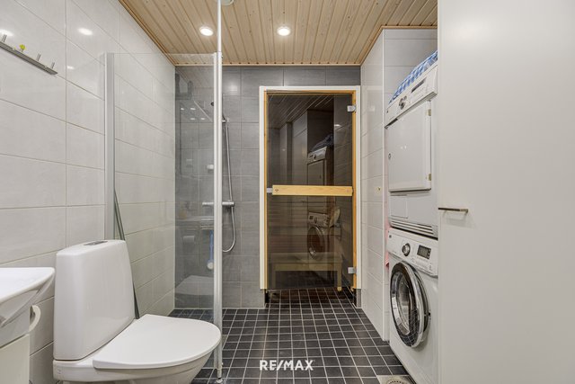 - WC-istuin, suihku, suihkuseinä, pesukoneliitäntä, lattialämmitys, peili, pesuallas, ja bidee-suihku
