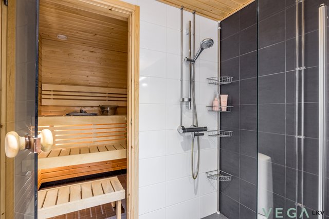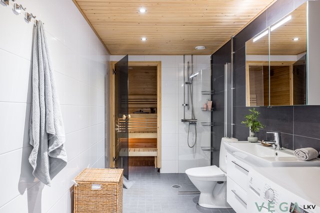 - Suihku, suihkuseinä, peilikaappi, pesuallas, allaskaappi, wc-istuin, pesukoneliitäntä, lattialämmitys. Lattia ja seinät laatoitettu.