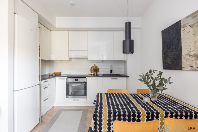 - Jääkaappi/pakastin, liesitaso, kalusteuuni, liesikupu, astianpesukone, mikroaaltouuni. Työtasot laminaattia. Parkettilattia, seinät maalattu