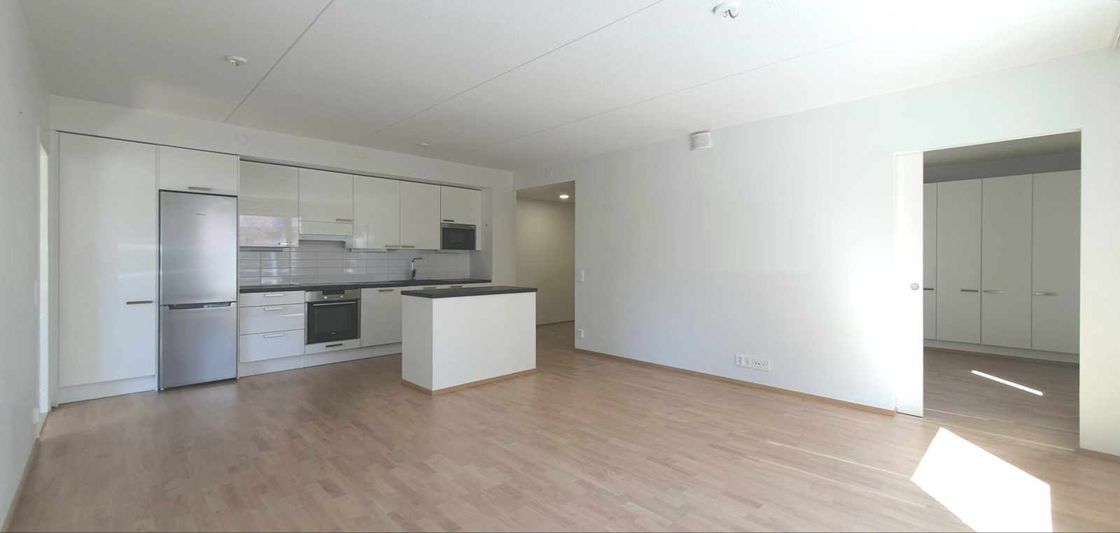 Tilava 2. kerroksen kulmahuoneisto vuonna 2018 valmistuneessa talossa.
