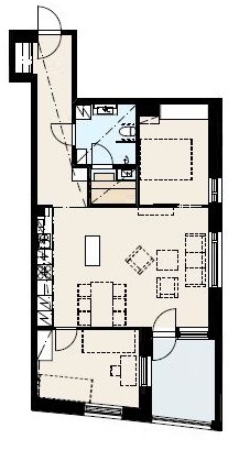 Asunnon olohuone on todella iso ja sen yhteydessä on avokeittiö, jossa on hyvin lasku- ja kaappitilaa sekä kulmaparveke etelään Konepajanpuistoon. Makuuhuoneissa on kiintokaappeja valmiina ja tilavan kylpyhuoneen yhteydessä on oma sauna.